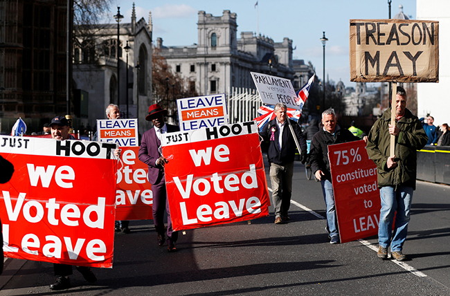 L'initiative «Marche pour partir [de l'UE]» a débuté le 16 mars, à l'appel entre autres, de l'eurodéputé trublion Nigel Farage, une des figures emblématiques de la campagne pro-Brexit en amont du référendum de 2016. «Les parlementaires vous ont ignoré, vous et votre vote [...] S'ils trahissent le Brexit, nous ne resterons pas assis comme des paresseux [...] Nous devons être prêts à nous rebeller», avait notamment déclaré Nigel Farage dans sa vidéo adressée aux citoyens britanniques.