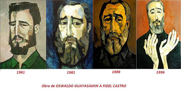 Portraits de Fidel peints par Guayasamin. De gauche à droite, les œuvres correspondent aux années 1961, 1981, 1986 et 1996. Photo : Fondation Guayasamin