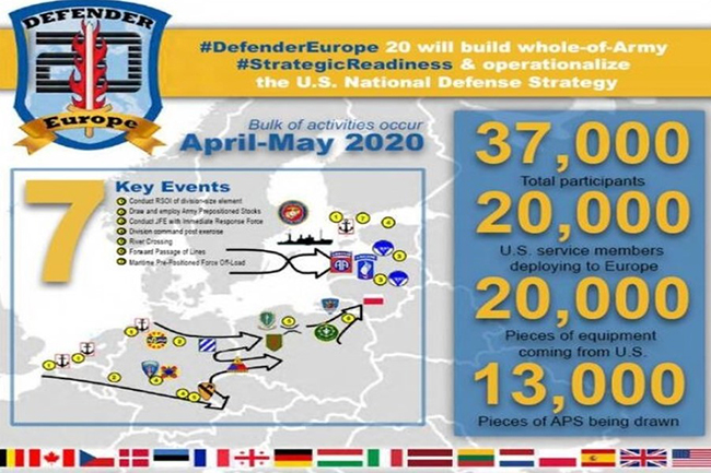Since March 5, well over 20,000 US soldiers have been landing in Europe, according to what Manlio Dinucci pointed out in his article in the Italian newspaper "Il manifesto" of March 3, informs us that the soldiers of the United States of America have taken to arrive in view of the drill "Defender Europe 20" «in 6 European harbours (in Belgium, Holland, Germany, Latvia, Estonia) 20,000 pieces of military equipment».