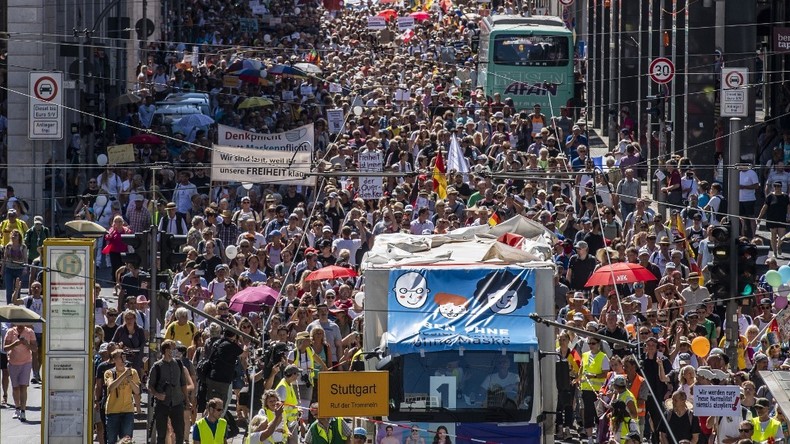 Des milliers de personnes ont défilé le 1er août à Berlin afin de protester contre les mesures imposées en Allemagne pour endiguer la pandémie de coronavirus, accusées de violer les droits et libertés des personnes.