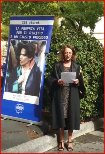 On 28 September, on the occasion of the first month of her death, before the Courts of many Italian squares (including those in Bologna, Bari, Florence, Pistoia, Arezzo, Padua, Prato, Torre Annunziata, Lucca, Bergamo and Ferrara), the lawyers met in toga together with the citizens to demonstrate in a sober and polite manner. Moments of silence followed the strong messages launched in honour of her sacrifice. The image of Ebru, now a symbol throughout the world of justice denied in Turkey, stood out everywhere.