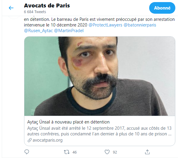 Le barreau de Paris est particulièrement choqué par les conditions d’arrestation d’Aytaç Ünsal, blessé notamment au visage par l’intervention des forces de l’ordre