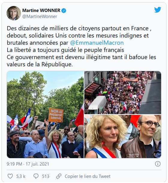 La veille, participant comme plus de 114 000 Français à une manifestation contre l'extension du pass sanitaire annoncée par Emmanuel Macron, Martine Wonner avait pris la parole devant les protestataires.