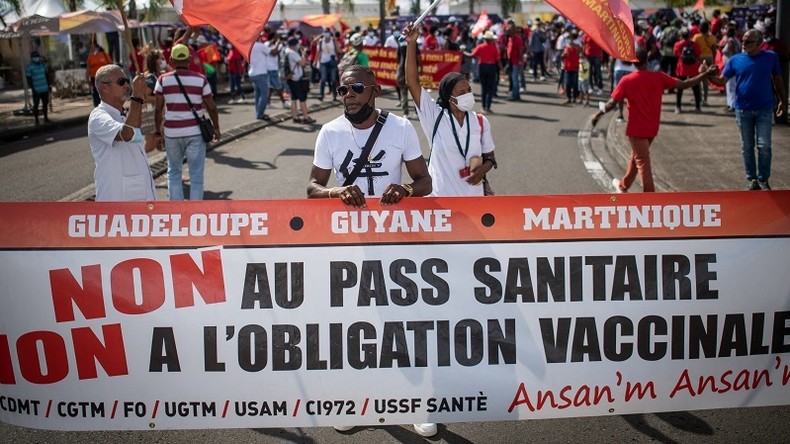 Les positions plutôt modérées des organisations syndicales en métropole ne sont pas du tout au diapason de celles de leurs antennes dans les Outre-Mer. Même si la date butoir de l'obligation vaccinale a été décalée dès l'été 2021 par le gouvernement, un mouvement de protestation éclate en novembre, à l’appel du LKP guadeloupéen, un collectif regroupant une cinquantaine d'organisations syndicales, associatives, culturelles ou encore politiques. Les syndicats signent alors un texte à la tonalité radicale, selon lequel «la guerre est déclarée» face aux suspensions de soignants ne souhaitant pas se faire vacciner. Opposés à l'obligation, les syndicats refusent que les salariés, y compris ceux de l'Education nationale ou de Pôle emploi reçoivent «leur courrier de suspension le 15 novembre», et s'associent à un mouvement qui tire en partie sa force d'une défiance vis-à-vis de l'Etat central déjà installée par l'utilisation du chlordécone.