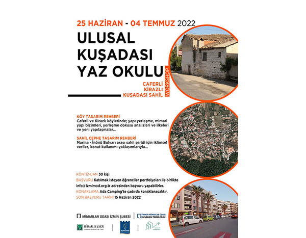 Mimarlık Vakfı Enstitüsü, Mimarlar Odası İzmir Şubesi ve Kuşadası Temsilciliği ve Kuşadası Belediyesi tarafından düzenlenen Kuşadası Yaz Okulu, 25 Haziran - 4 Temmuz 2022 tarihleri arasında gerçekleşecek. Yaz okulunda Caferli, Kirazlı köyleri ve Kuşadası Sahil üzerinde doku, mimari, kentsel alandaki yer, yerleşme konuları üzerine çalışılacak.