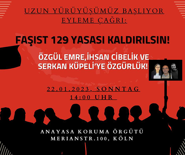 Faşist 129 Yasası Kaldırılsın Komitesi olarak tüm halkımızı uzun yürüyüşümüze katılmaya çağrıyoruz. Uzun Yürüyüşün başlangıcı, Köln şehrinde bulunan Anayasayı Koruma Örgütü binasının önünde 22 Ocak tarihinde yapacağımız eylem olacaktır.