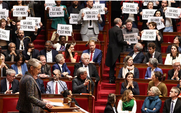 Elisabeth Borne, 16 Mart PerÅŸembe günü Ulusal Meclis'te, emeklilik reformunu kabul etmek için 49.3'ün kullanılacağını açıklarken, Meclis’teki çoÄŸunluk ise “ 64 YaÅŸa Hayır” dövizleri ile tepkilerini dile getirdiler.