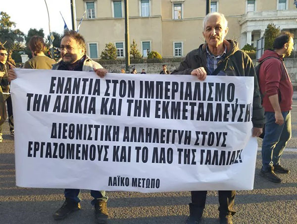Yunanistan Halk Cephesi de eylem ve mitinge “Emperyalizmin Haksız ve Sömürüsüne Karşı Fransa İşçi Sınıfı ve Emekçi Halkları İle Enternasyonalist Dayanışma İçindeyiz” Pankartı ile katıldı. Miting atılan sloganlar ve yapılan konuşmalar sonrasında Fransa Elçiliği’nden Propilia Meydanına kadar yüründü ve Propilia Meydanı’nda iradi olarak bitirildi.