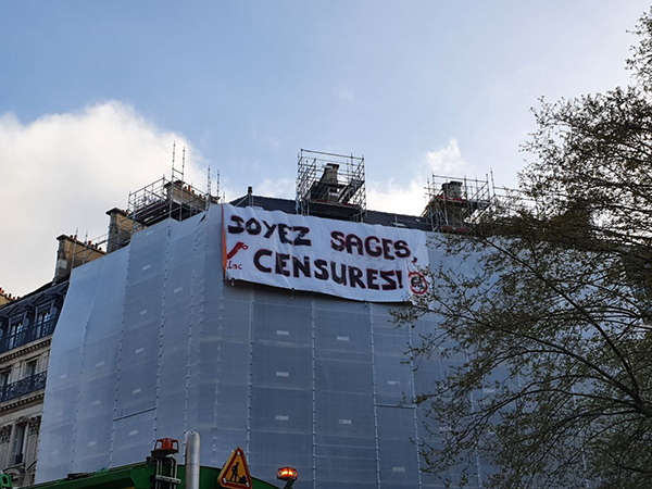 L’association a dénoncé ce matin l’arrestation de quatre de ces activistes qui avaient déployé une banderole « Soyez sages, censurez ! » aux abords du Conseil constitutionnel. « Ces arrestations arbitraires et pour des actions symboliques se multiplient, portant atteinte à notre droit de manifester », écrit l’association sur Twitter.