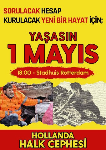 Hollanda Halk Cephesi yaptığı yazılı açıklama ile 1 Mayıs emekçilerin bayramında18:00'de Rotterdam Stadhuis’te yapılacak etkinliğe çağrıda bulundu.