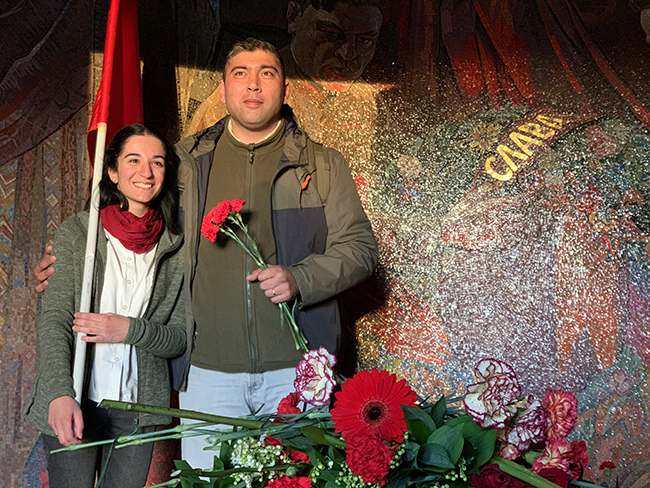 “1871 Paris Komününden bu yana halkların kanlarıyla, emperyalizme ve faşizme karşı ödedikleri bedellerle simgeleşen Kızıl bayraklarımızdan korkuyorlar!” diyen Güler, konuşmasına şöyle devam etti; “Treptower Park'ta Sovyet Savaş Anıtı içerisinde polis tarafından alınan yoğun güvenlik önlemleri karşısında direnişçimiz Eda Deniz Haydaroğlu ve arkadaşlarımız alana kızıl bayraklarımızı getirdiği için polis tarafından durduruldu. Alman devleti neden bu kadar kızıl bayraklılardan korkmaktadır? Bu korkunun acele faydası yoktur!