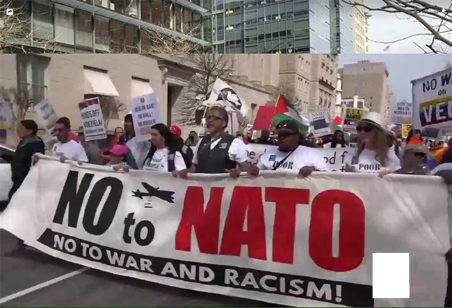 La marche visait à afficher « une opposition populaire de masse » à l’OTAN, aux guerres, au racisme et à une invasion éventuelle du Venezuela par les États-Unis, a déclaré le Comité directeur de la mobilisation nationale, une coalition informelle de militants représentant des dizaines de mouvements pacifistes et de groupes d’action.