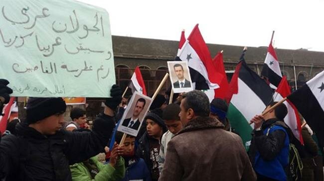 Les participants au sit-in ont hissé des drapeaux nationaux et scandé des slogans qui confirment que le Golan occupé est un territoire syrien et que la décision de Trump va à rebours des résolutions onusiennes.