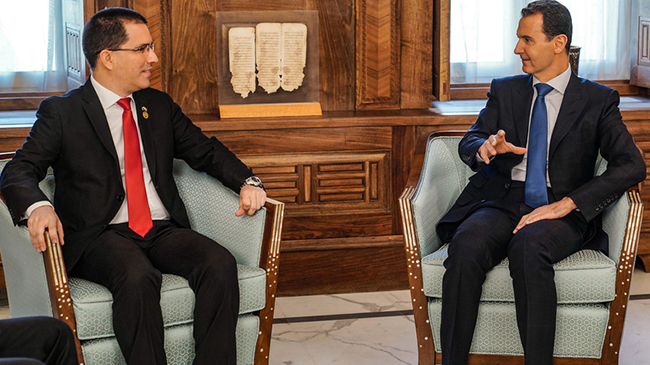 En tournée au Moyen-Orient, le chef de la diplomatie vénézuélienne Jorge Arreaza a été reçu (4 Avril) par Bachar el-Assad. Au cours de leur entretien, ce dernier a souligné que la Syrie, comme le Venezuela, subissaient les contrecoups de l'ingérence étrangère.