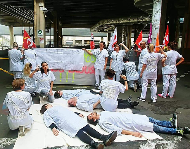 Dans une vidéo publiée par le même journaliste, les personnes mobilisées sont positionnées côte à côte, en silence, le poing levé, pendant qu'une voix commente l'action au mégaphone : «Les urgences à travers toute la France [se sont] arrêtées de travailler symboliquement pour exprimer leur ras-le-bol et leur souffrance.»