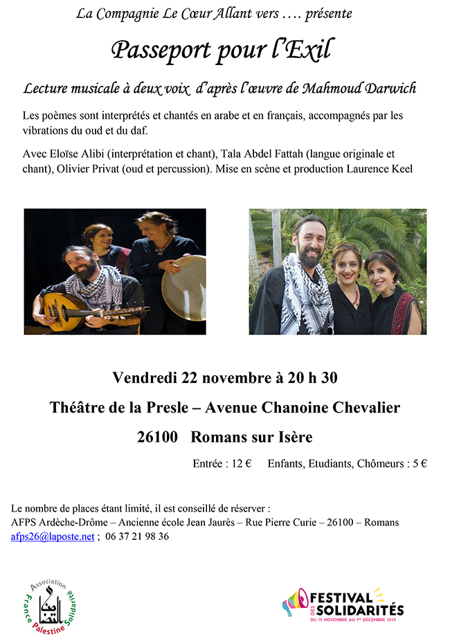 Vous êtes invité au spectacle « Passeport pour l’exil » par la Compagnie « Le Cœur allant vers … » qui aura lieu le vendredi 22 novembre à 20 h 30 au Théâtre de la Presle à Romans.