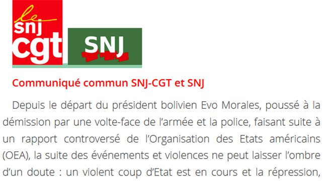 Ce qui se passe en Bolivie est un coup d’Etat sanglant. Le SNJ-CGT et le SNJ appellent tous les journalistes français et francophones à ne pas avoir peur des mots et à appeler les choses par leur nom. Nous apportons également toute notre solidarité à tous nos collègues boliviens et sud-américains, par l’intermédiaire de la FEPALC et de la FIJ.