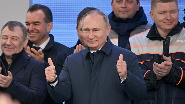 Un an et demi plus tôt, au volant d’un véhicule du constructeur russe Kamaz, Vladimir Poutine avait déjà inauguré la voie routière de ce pont de 19 km. La capacité totale du pont est estimée à 40 000 véhicules et 47 trains par jour, permettant ainsi la circulation de 14 millions de passagers et de 13 millions de tonnes de marchandises par an.