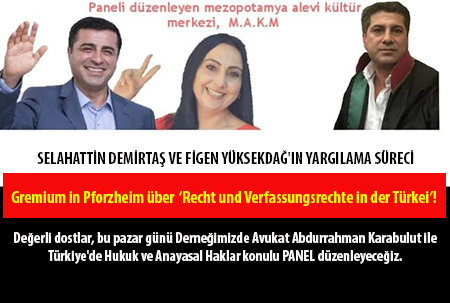 Der Vorstand des in Pforzheim betriebenen Mesopotamischen Alevitischen Kulturzentrums veranstaltet an diesem Sonntag um 14.30 Uhr um 14.30 Uhr eine Podiumsdiskussion zum Thema "Recht und Verfassungsrechte in der Türkei" über die anhaltende Gesetzlosigkeit und Ungerechtigkeit in der Türkei.