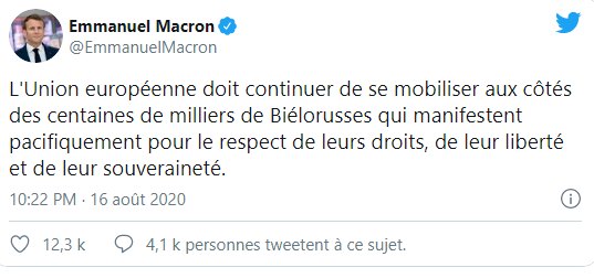 «L'Union européenne doit continuer de se mobiliser aux côtés des centaines de milliers de Biélorusses qui manifestent pacifiquement pour le respect de leurs droits, de leur liberté et de leur souveraineté», a estimé Emmanuel Macron sur Twitter le 16 août.