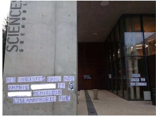 « Des fascistes dans nos amphis. L’islamophobie tue », pouvait-on notamment lire sur l’un des collages, appelant à la démission des deux professeurs. Dès le lendemain, la direction de Grenoble avait adressé un signalement à la justice.