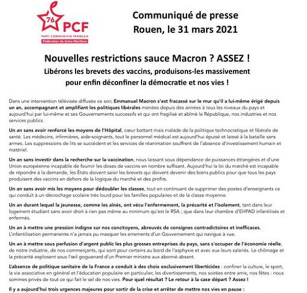 Les communistes sont déterminés à agir aux côtés des gens pour faire tomber le mur de l’argent, mettre la main sur les brevets des vaccins pour enfin déconfiner nos vies. Ajouter des restrictions aux restrictions n’est en aucun cas une solution durable après déjà une trop longue année de crise et d’improvisation gouvernementale.
