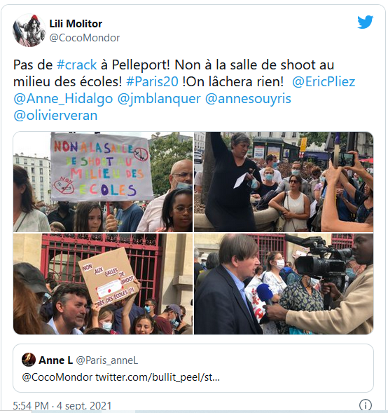 Une manifestation a été organisée devant la mairie du XXe arrondissement de Paris, le maire Eric Pliez souhaitant aménager en salle de shoot une école à l'abandon, dans le cadre du plan lancé par Anne Hidalgo pour la prise en charge des toxicomanes.