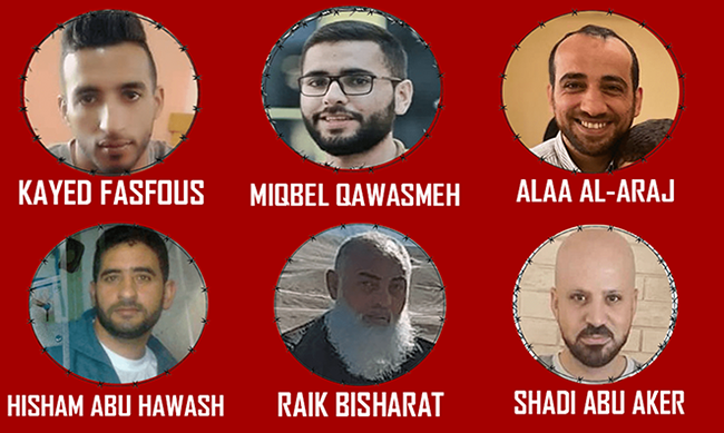 Les détenus en grève sont Kayed al-Fasfous (en grève depuis 59 jours), Miqdad Qawasmeh (en grève depuis 52 jours), Alaa al-Araj (en grève depuis 34 jours), Hisham Abu Hawash (en grève depuis 26 jours) Raik Bisharat (en grève pendant 21 jours) et Shadi Abu Aker (en grève pendant 18 jours). Alors qu’Ahmad Hamamra a suspendu sa grève de la faim mercredi 1er septembre, avec un accord pour obtenir sa libération le 14 février 2022, Shadi Abu Aker a entamé il y a 18 jours une grève de la faim pour sa libération.