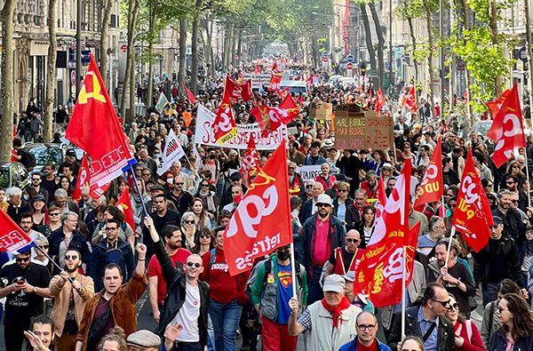 A Lyon, le défilé du 1er-Mai à demare de la place Jean-Macé, sous un soleil printanier. « Pour la première fois depuis longtemps, nous constatons un appel intersyndical, sur la base de revendications claires », se félicite Jérémy Ferrer, 30 ans, technicien informatique à la Sécurité sociale.