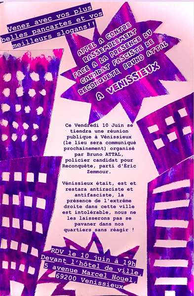 Appel à contre rassemblement face à la présence du candidat fasciste de reconquête, Bruno Attal à Vénissieux