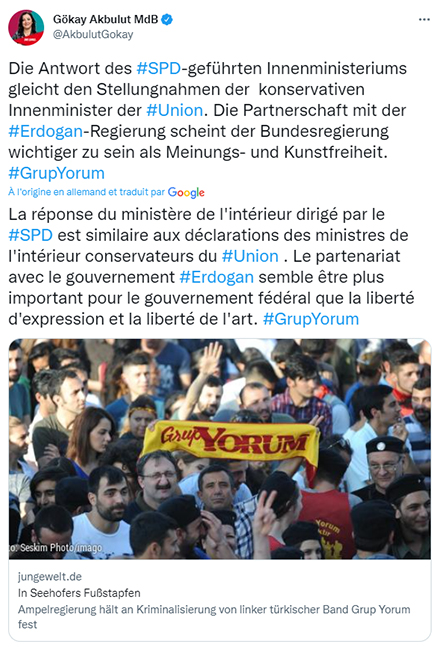 »Diese Einschätzung zu Grup Yorum ähnelt doch sehr der Haltung der türkischen Regierung unter Erdogan«, beklagte Akbulut am Mittwoch gegenüber jW. Befremdlich erscheine die Antwort des SPD-geführten Innenministeriums auch angesichts der Tatsache, dass in der Türkei selbst die Oppositionspartei CHP – die Schwesterpartei der SPD – Lieder von Grup Yorum auf ihren Wahlveranstaltungen abspiele und deren Musiker gegen staatliche Verfolgung in Schutz nehme. Die Partnerschaft mit Ankara scheine der Bundesregierung wichtiger zu sein als Meinungs- und Kunstfreiheit, vermutete Akbulut. So verteidige Bundesinnenministerin Nancy Faeser (SPD) die von ihrem Vorgänger Horst Seehofer (CSU) 2019 ausgesprochenen Verbote kurdischer Buch- und Musikverlage.